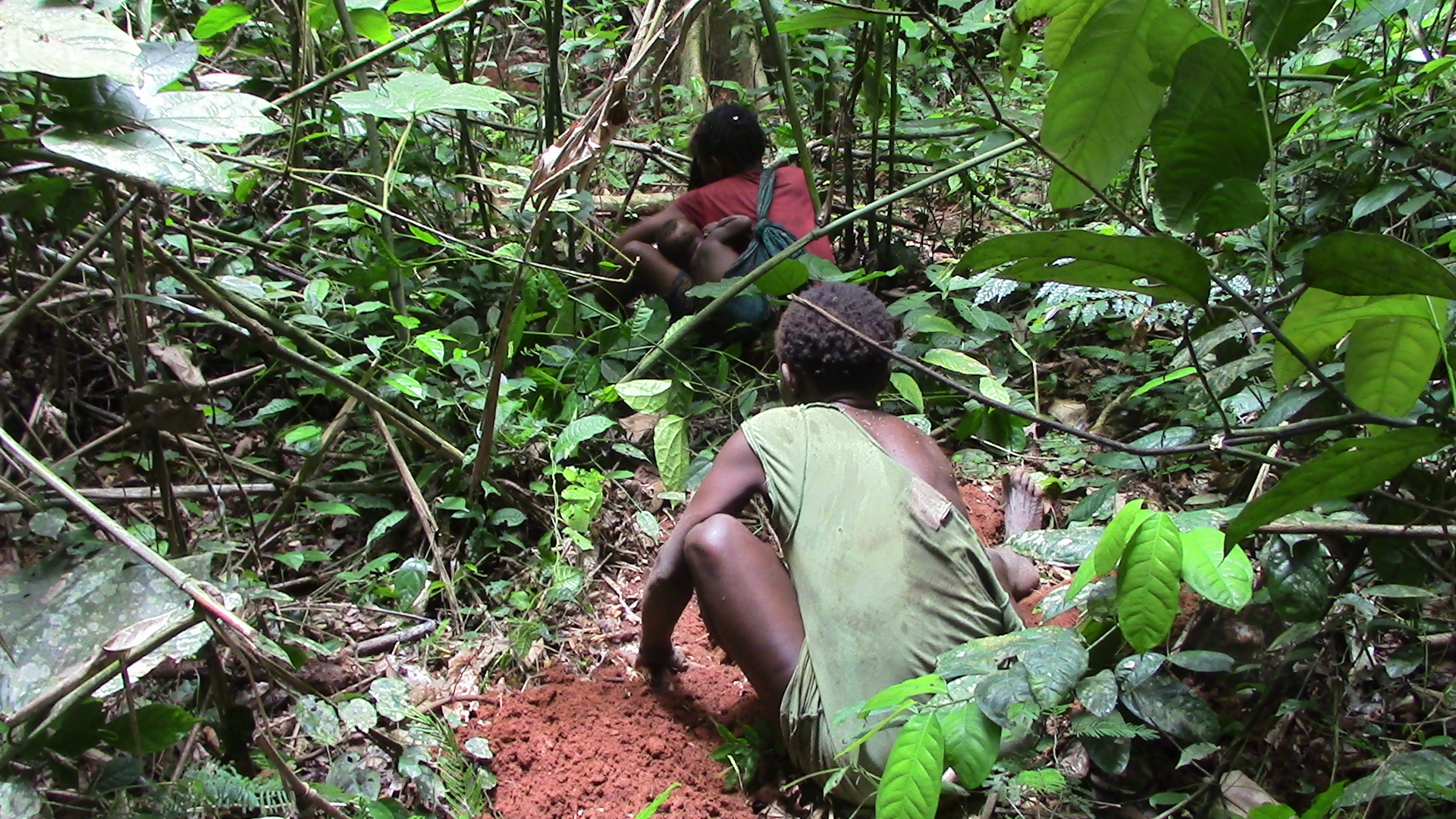 • A child being held by the grandmother during a tuber digging event, while her mother is digging and singing in front of them (Photo: Karline Janmaat 2016)